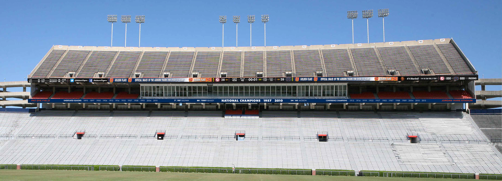 From Auburn: The ribbon boards have been redesigned to provide more in-game data for the in-stadium viewing experience. On the far left side of the board, fans will see rotating coverage of out-of-town scores, Auburn messages and social media streams. In the middle, will be the game-in-progress information with score, down, distance and time. The far right of the board will keep running team and individual statistics for each team.